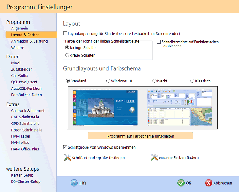 Neben den von HAM Office 4 und 5 bekannten Layouts gibt es jetzt zwei neue Farblayouts ("Nacht" und "Windows 10").