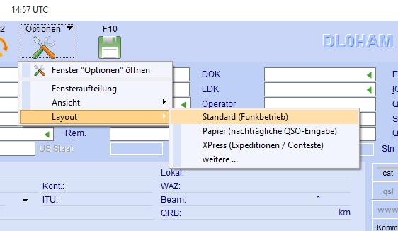 Bild unten:Das QSO-Fenster hat jetzt 3 Grundlayouts für "normalen" Funkbetrieb, nachträgliche QSO-Eingabe und Contest/ Expeditionsbetrieb. Jedes dieser Layouts kann separat angepasst werden. Durch einen Menüpunkt oder die Optionenleiste kann man dann schnell zu diesem Layout wechseln und muß nicht für jeden Anwendungsfall immer wieder Optionen im Optionenfenster ändern.