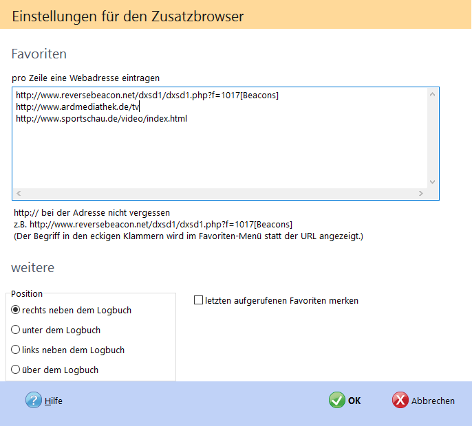 Neben der Position des Browsers in Bezug auf die Logbuchliste kann man auch eine Option anhaken, dass beim nächsten Öffnen dieses Browsers die aktuell angezeigte Webseite wieder geöffnet werden soll.
