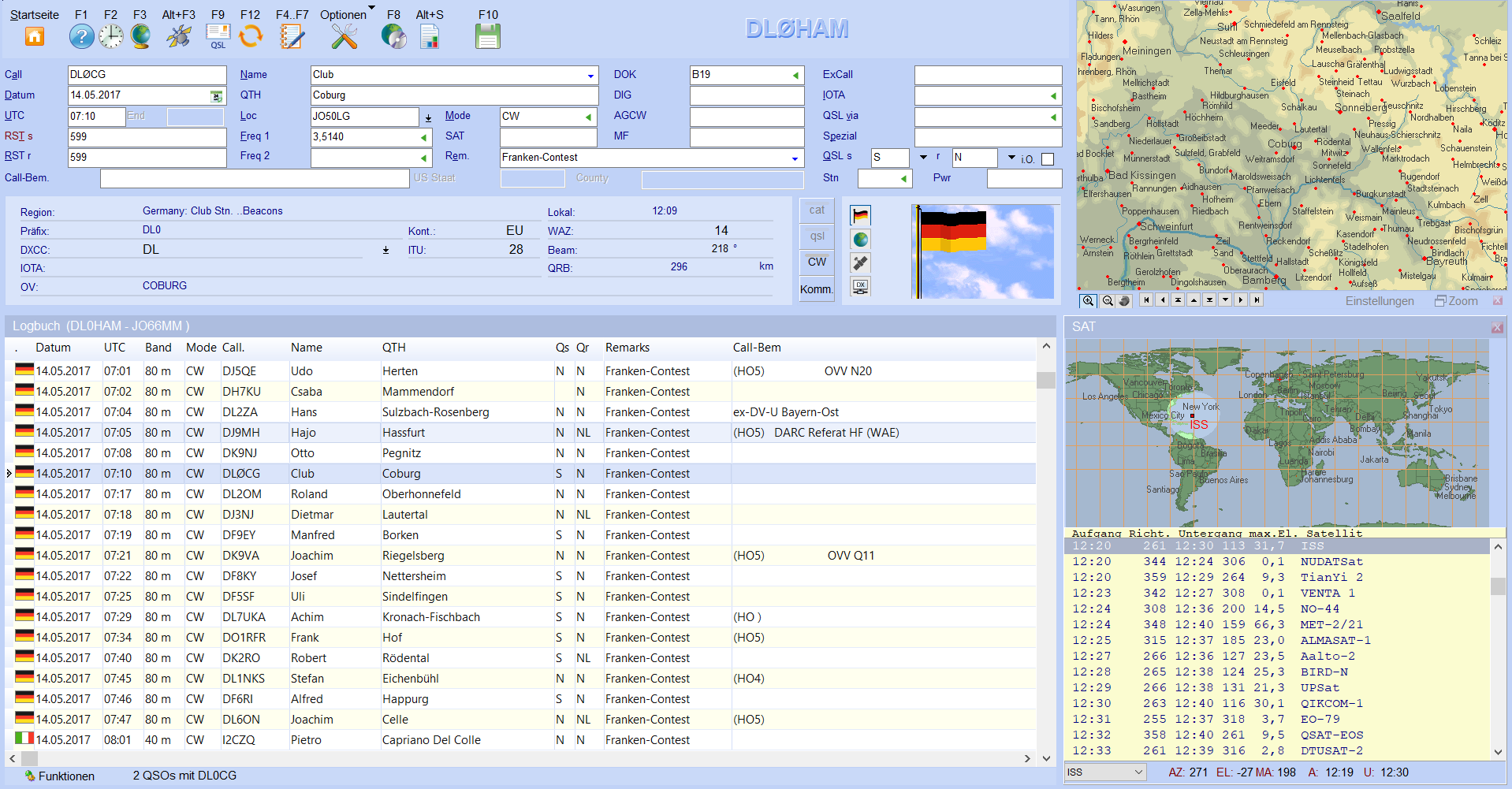 Bild oben:QSO-Eingabe: oben rechts: Karte, unten Logbuch, Satelliten und Statistik, in der Mitte Flaggen-Infofenster